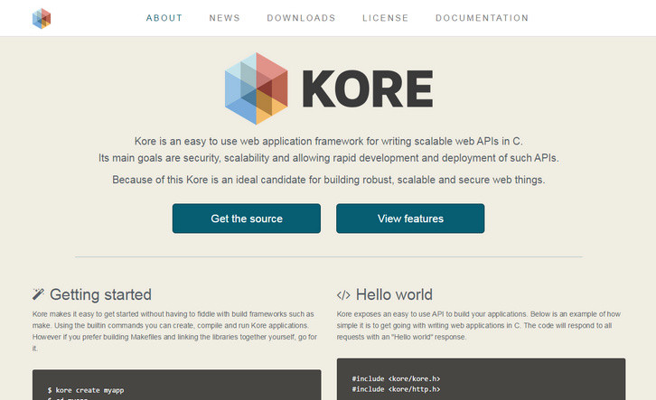 Kore makes it easy to get started without having to fiddle with build frameworks such as make. Using the builtin commands you can create, compile and run Kore applications. Kore exposes an easy to use API to build your applications.