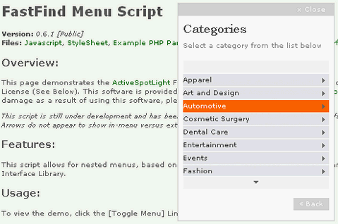 FastFind Menu Script is a javascript menu created by ActiveSpotLight under the BSD License. It pulls a content feed as data to populate the menu, this can be static or dynamic. The version they use internally uses JSON/XML as data feeds. This script allows for nested menus, based on dynamic Ajax responses. The menu can also be dragged/dropped by using the jQuery Interface Library. I really like the menu because it is very clean and smooth. It is very extremely useful for any web applications that has no space to place a menu.