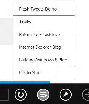 When the user launches the site from the Start screen, the pin button shows that there are jump lists available for this site:
