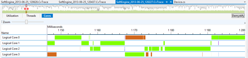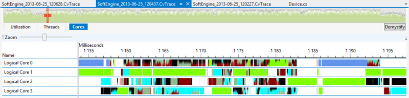 Well, in this case, drawing several lines in parallel is not feeding the cores enough. We’re then spending more time in context switching and moving from one core to another than doing some real processing. You can check that with the embedded profiling tools of Visual Studio 2012 : Concurrency Visualizer for Visual Studio 2012