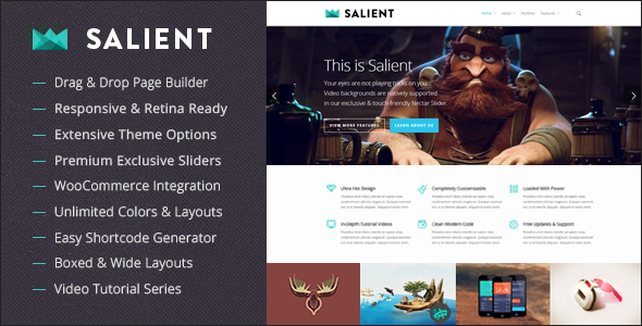 Salient is a simple but productive WordPress theme that comes with impressive features such as a drag-and-drop-based page builder, a responsive and retina-powered design & layout, unlimited combinations of colours and layouts by means of the custom generator, integration with WooCommerce to support the eCommerce aspect of your site / blog, etc. On top of all, you have a great range of support video to seek help from.