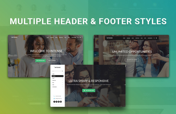 Although footers are not as visible as headers, they often contribute significantly to usability of a website. Intense includes 10 completely different footer layouts – from simple one-liners to complicated mega footers with multiple columns, incorporated forms and social widgets.