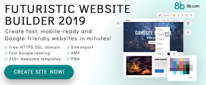The 8b website builder is brand-new, super simple to use, and futuristic in its design. 8b lets you build your portfolio site from your desktop or on your mobile device when you’re on the go. Google AMP ensures your final product will be both mobile-friendly and lightning-fast and the site itself can be turned into a mobile or desktop app. 250+ website sections and 18 slick templates will get your project off to a fast start.